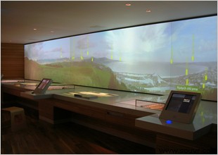 他還說,Land Design工作室要求完全采用原始分辨率,以避免圖像效果降低,并要求Sysco必須首先提交所有投影機,以進行實驗性檢驗。 博物館采用Christie設備,在樓梯頂部的墻上投影出巨幅城市全景。 9米長(3072 x 768像素)的幕布由三塊互動的觸摸屏控制(每塊屏幕控制一個滾動條),采用三臺LX37進行投影。 系統以三臺雙輸出PC電腦作為信源,一路輸出到投影機,一路輸出到17英寸的觸摸屏。