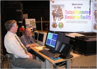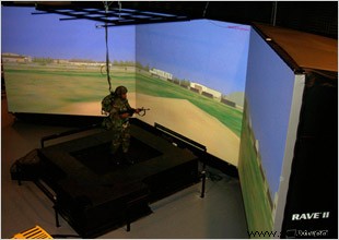 位于馬里蘭州Aberdeen Proving Ground的陸軍研究實驗室(ARL)正在試用一套獨特的虛擬現實系統,來投影模擬的戰斗環境的逼真影像。 RAVE II™ 由Fakespace Systems Inc裝配,是ARL的戰術環境模擬設施的一部分,該設施由兩個模擬器組成。 第一個叫敵方環境模擬器,是功率為50000瓦、有33個揚聲器的系統,可以發出155分貝的脈沖聲音效果。