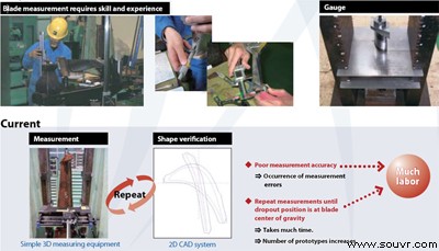 由于這些三維葉片表面不規則,因此專為每個葉片制作了測量儀器以確保制造過程中的質量。 然而,測量結果因檢驗員的經驗和技能而異,由專家重新測量或確認測量導致了重大的時間損失。