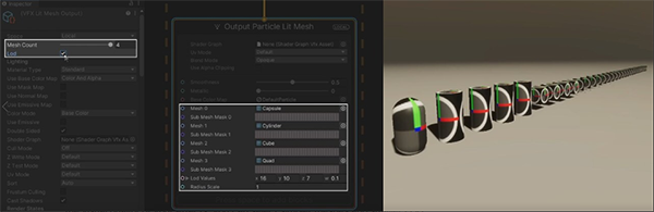 在檢查器中選擇網格輸出時,我們可以訪問新的“網格計數”屬性,該屬性允許為輸出指定最多四個網格。如果啟用了細節層次復選框,粒子將根據它們所占屏幕的百分比來選擇網格。