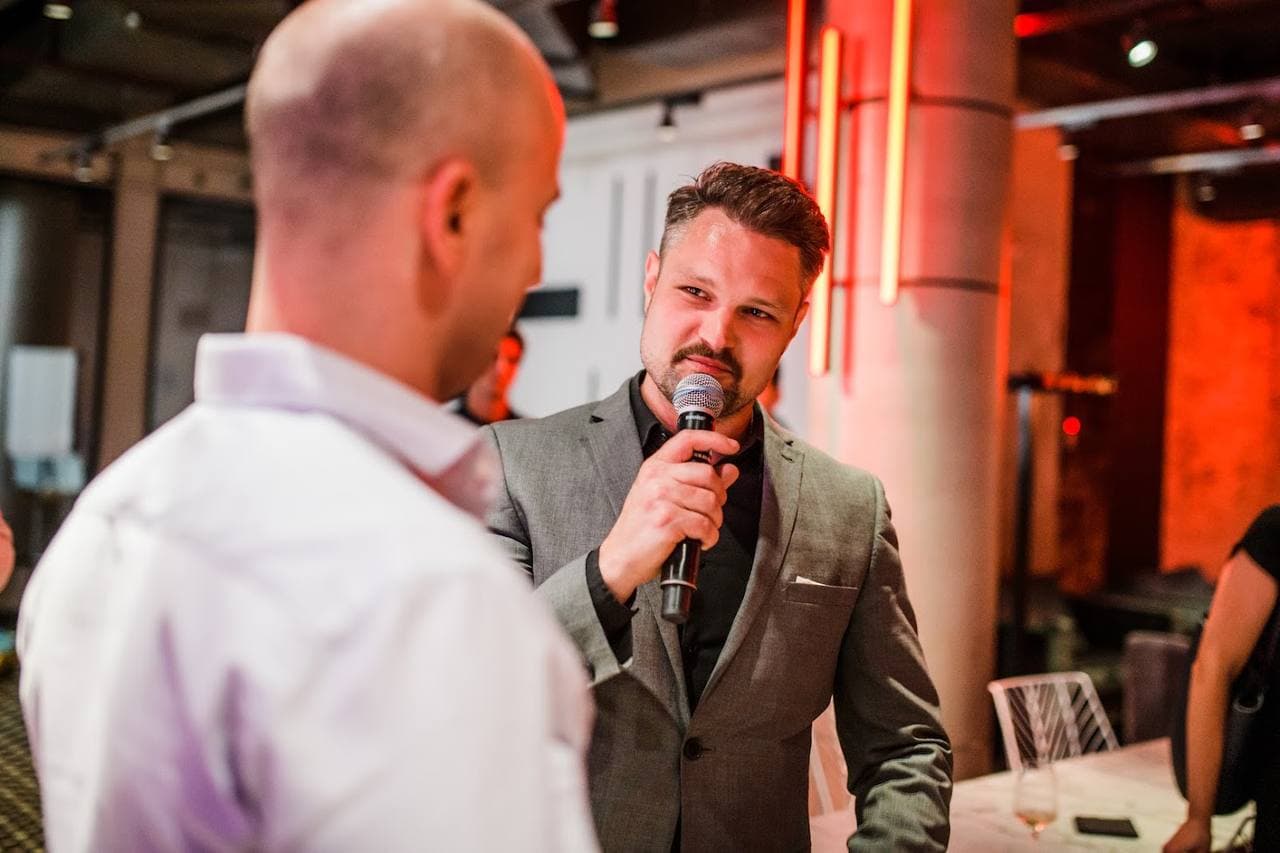 Aragorn Meulendijks(右)在活動中采訪與會者。