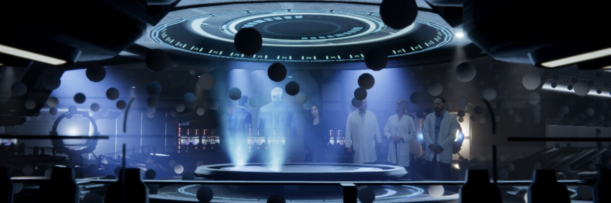 為此,我將綠幕鏡頭導入到Adobe After Effects初步做出外觀,然后用HDRP后處理中的Volumetric Fog來照亮全息影像的光線。隨后我將After Effects的片段導入到新建的一個多邊形上。然后用渲染紋理來放置角色。這樣一來,他們就能與場景的燈光互動,在周圍和Volumetric Fog上投下陰影。