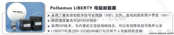 Polhemus公司的LIBERTY系統是一款快速精確的電磁跟蹤設備,為6自由度跟蹤技術領域帶來了巨大飛躍。該系統最多可配備16個傳感器,通過可擴展支架進行固定,在跟蹤技術領域中首屈一指。此外,系統還采用了先進的數字信號處理器(DSP)元件、直觀的圖形用戶界面(GUI)、以及其他先進技術元件,為專業人士提供了理想的解決方案。