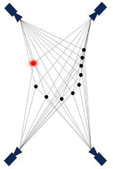 (**)進行跟蹤的標記必須能夠為兩個或更多個鏡頭可見。整體跟蹤空間的尺寸是由攝像范圍、鏡頭布局及背景照明共同決定的。